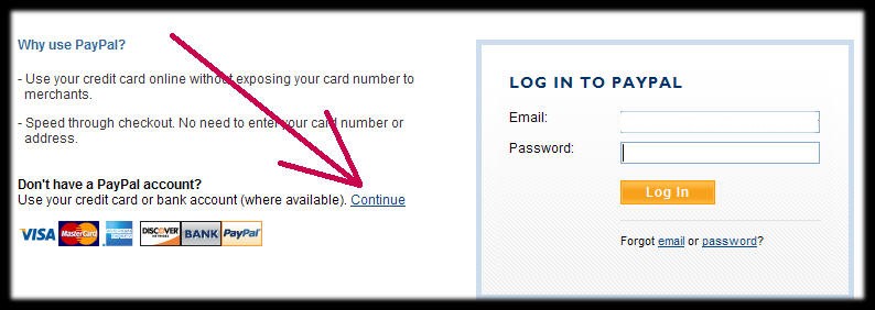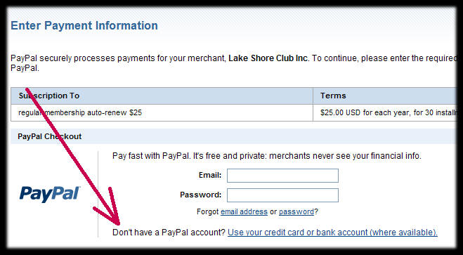Select the appropriate button (subscribe/add to cart/donate), then look below or left of Email/Password boxes and click on "Don't have a paypal account? ...".